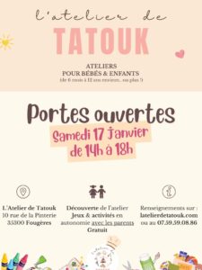 Ce samedi 17 janvier, de 14h à 18h, vous pouvez venir découvrir L’Atelier de Tatouk, un nouvel espace créatif et bienveillant pour les enfants de 6 mois à 12 ans environ 🎉